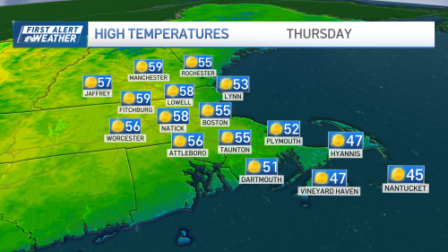 The tide is turning against the cold and today marks the start of the real warmup. Highs will jump back into the mid and upper 50s under more blue skies. There are exceptions to this temp range, however, thanks to the wind direction. From the North Shore to the Seacoast and all of southeastern Massachusetts and Cape Cod, we’ll see highs in the upper 40s due to the southeast wind. |