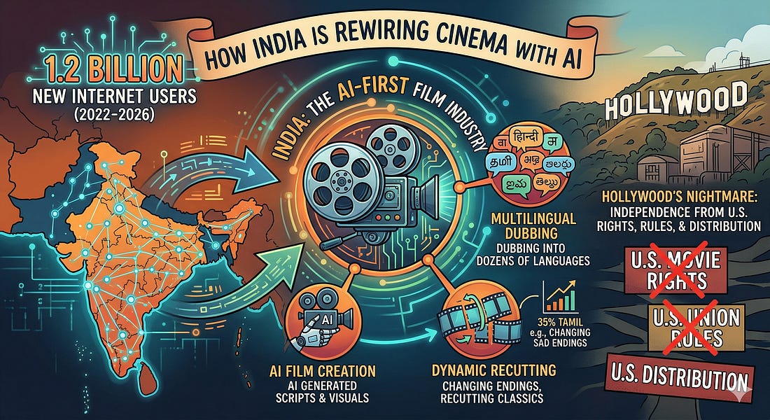 The Medium is for executives, investors and creators navigating a market where the rules for owning and monetizing AI-native IP are fragmented, incomplete and unevenly developing. Bollywood Is Running Hollywood's Forbidden ExperimentIndia is building the AI-native film industry Hollywood's lawyers, unions and insurers are spending every resource to prevent—and it is working at the box office.[Author’s Note: This essay is free for all subscribers.] Google has previously estimated that there will be 1.2 billion new users who gain access to the internet between 2022 and the end of 2026. Services like SpaceX’s Starlink and Taara—an Alphabet X Moonshot company that uses beams of light to deliver high-speed data links—are expanding internet access to rural areas globally, and particularly in India and Africa. As I wrote last August, this generation will be “the first to access the internet via AI platforms like ChatGPT and Claude, and not via start pages like Google, Yahoo or web browsers.” Reuters recently reported one impact of this new generation’s emergence in India: Bollywood studios “deploying AI at a scale unseen elsewhere” and audiences willing to pay for their AI-generated and AI-edited content. Bollywood producers are iterating and shipping AI-produced content, and audience demand is absorbing the rapidly evolving supply. India is an emerging AI media marketplace that is unburdened by the regulatory and economic constraints of the U.S. marketplace. It is also rapidly being reshaped by growing internet access. It offers an important market test of Hollywood’s fear and AI platforms’ hopes for the future of entertainment. The 1.2 BillionIndia now has 958 million Active Internet Users according to the Internet and Mobile Association of India (IAMAI). That reflects 8% year-over-year growth. 548 million active internet users in rural areas account for over 57% of total users. Those are growing at nearly four times the pace of urban India. 38% of India’s population—nearly 579 million people—are not yet active internet users. Reuters depicts this emerging generation of Indian consumers as having media diets evolving away from theatrical and shifting to streaming. This has resulted in production budgets being cut. Now they consume “full-fledged AI-generated films”, movies dubbed in numerous languages using AI and older titles recut with AI to revive ticket sales at lagging theaters. AI dubbing is particularly powerful in India, which has 22 official languages and hundreds of dialects. The technology substantially reduces the cost of serving submarkets of languages and dialects, which in turn creates new demand across those submarkets. Aggressive Supply SideReuters also depicts a supply side aggressive on both costs and technology to meet this changing demand. A Bollywood director told Reuters: “In India, cinema isn’t about art. It’s purely business, so studios are going to use it to make mythologicals. Our audience is a sucker for it.” The business logic favoring mythology has echoes in the AI-generated Revolutionary War series titled “On This Day ... 1776” from Hollywood director Darren Aronofsky and his AI-focused venture Primordial Soup—sponsored by Google, Salesforce and Time, and distributed on YouTube. On the 250th birthday of The United States of America, its founding mythology has never been more important. They are proving there is a business in cheap AI-driven productions of American history guided by Hollywood production talent and without Hollywood acting talent (although George Washington often looks like Sean Penn). “On This Day ... 1776” is an independent venture structured to avoid paying expensive actors and production guilds, distributed on YouTube to bypass theatrical and streamer gatekeeping and sponsored to avoid relying on direct-to-consumer spending or streaming economics. It routes around Hollywood market constraints that are weaker or nonexistent in Bollywood. Reuters noted that PVR Inox, India's largest cinema chain, is a partner in the experiment, not a casualty of it—AI recuts are being deployed to revive ticket sales at lagging theaters, inside the same window Hollywood is watching collapse (in 2025, location intelligence provider Kalibrate estimates average visit volumes declined by 15% year over year across major movie theater chains). Technology firms are meeting the moment: Nvidia recently told an audience at India’s AI film fest that it is working to slash computing costs so that anyone can “create something substantial without putting a lot of money” into production. This is structural alignment. Traditional storytellers are increasingly relying on AI and the technology firms are eager to deliver the infrastructure to help them. No one is waiting on anyone else to make the first move. Every constraint that paralyses the U.S. media and entertainment industry is missing in India. There is no SAG-AFTRA equivalent forcing consent for digital replicas, no copyright cases against AI platforms in a slow appeal process, no DMCA architecture to litigate around and no insurer refusing to underwrite AI risk. The system does not need valuable IP. The myths are Indian, the audience is Indian, the distributors are Indian, and the only U.S. asset in the chain is the compute and model layer that the production companies rent by the hour. A Hollywood Nightmare in BollywoodIndia is the AI-native media marketplace Hollywood is fighting to prevent. It is evolving this fast because the 1.2 billion are not being converted from a prior media diet. The demand side is AI-native from first contact. Their first internet experience is an AI platform, their first filmed entertainment is AI-generated mythology in their own dialect and their expectations are being set by what Bollywood ships this quarter. Supply and demand are forming together to create a new world of entertainment consumption—the only missing ingredient is Pro