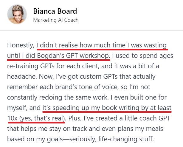 P.S. - Still unsure? Here's what Bianca said after building her first custom bot through Bogdan's workshop:
