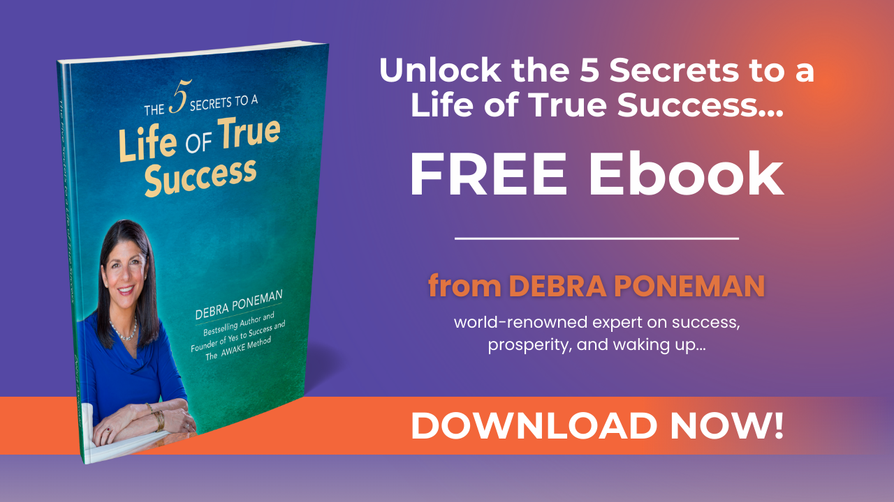 "I read every word of your book, and it was breathtaking!! Truly amazing. This is the best e-book I’ve ever read." ~ Shelly Lefkoe, Co-founder of the Lefkoe Institute "Of all the teachers we have access to in our online world, Debra Poneman stands out. Her e-book is profoundly life-changing. Your life will never be the same." ~ Katherine Woodward Thomas, NY Times Bestselling Author of Conscious Uncoupling "I’d become immune to e-books promising to change my life, but after hearing you on a podcast, I gave it a glance. I’m in tears. My heart has burst wide open. I’m committed to following your steps to true success." ~ Carolyn D., Chicago Ready to start your journey to true success and awakening? If you’re ready to experience peace, happiness, and the kind of success that comes from the inside out, download my e-book now.
