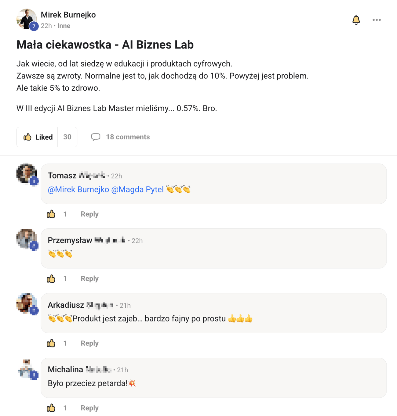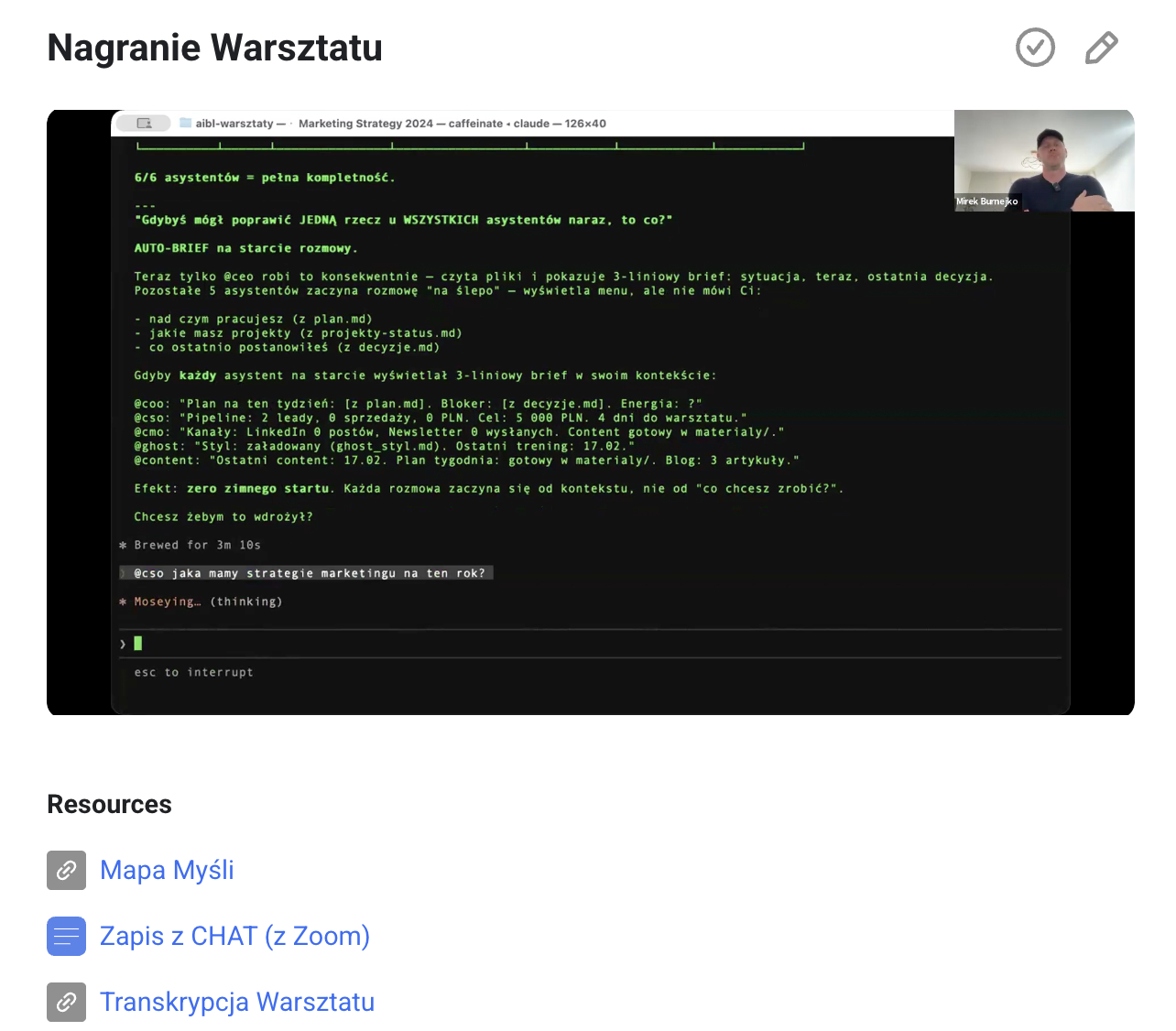 Kupując dostęp ALL ACCESS masz dostęp do mnie. Zawsze po warsztatach, nawet jak przechodzisz je offline (np. edycję III) to możesz napisać do mnie i pomagam 1:1. Masz dziwne wyzwanie? Coś nie działa? Piszesz do mnie. Nie do mojego zespołu. Nie do AI. Do mnie. I pomagam. To część mojej pracy.